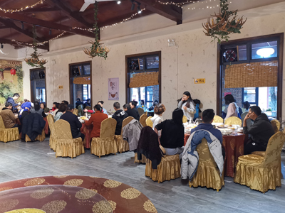 暮色降臨,到了大家最喜歡的幸福食光,火鍋蒸汽騰騰,羊肉在鮮白的湯里“咕嚕咕?!狈瓭L,看得人直流口水,配上沙朗生態(tài)新鮮的綠菜,好一頓美味佳肴,醇香爽口的美酒,吃出另一番風(fēng)味。